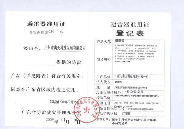 避雷器产品准用证